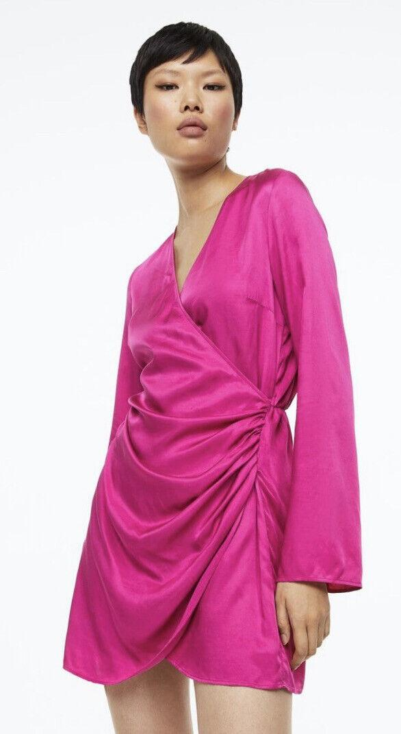 Rochie cu mânecă lungă din satin fucsia, cu mâneci late, cu decolteu în V