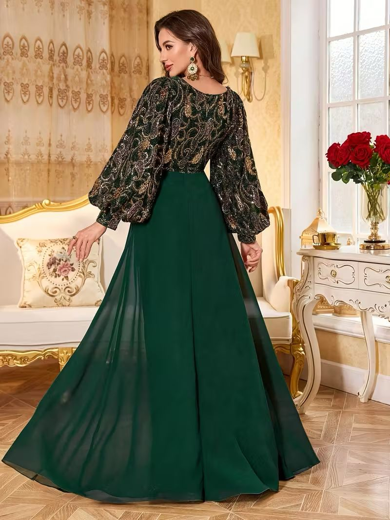 Rochie de Seară Formală Verde Smarald cu Decolteu în V, Mâneci Lungi și Paiete și Broderii - Rochie Elegantă cu Mâneci Bufante, Tren Super-Lung și Umplutură pentru Piept pentru Femei