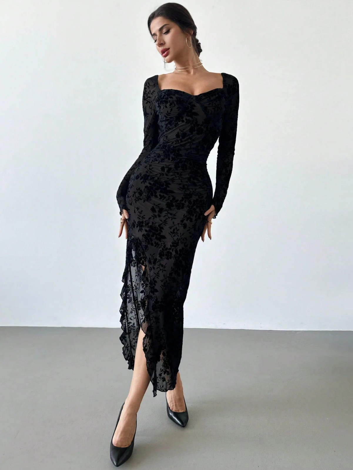 Rochie elegantă de toamnă/iarnă, cu imprimeu floral și decolteu pătrat, cu fâșii și tiv cu volane