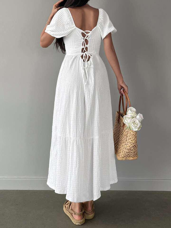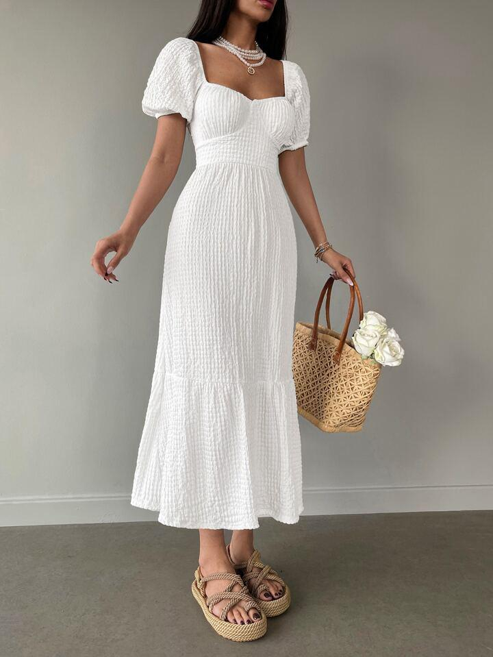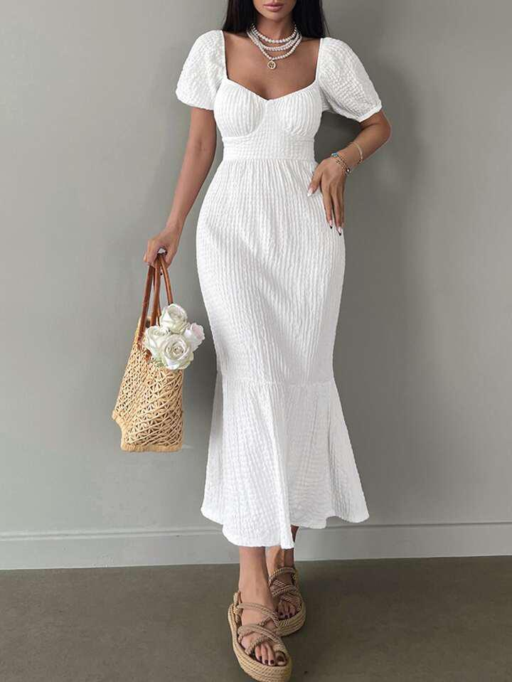 Rochie RueChic cu decolteu în formă de inimă, mâneci tip felinar și tiv încrețit